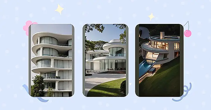 Imagine living here! You’d never have to worry about bumping into a sharp corner again; it’s all smooth sailing, literally. With those enormous curved windows lighting up the night like a super-stylish lantern, you’d feel like you’re living inside a giant, futuristic art piece. Plus, those palm trees just chilling out front make it look like this house is always ready for a fancy vacation, even if it’s just staying put. It’s definitely not your average cardboard box house; this place has personality, curves, and probably an amazing Wi-Fi signal too.