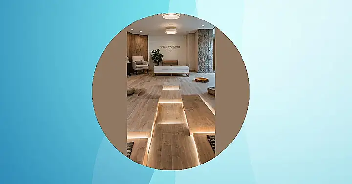 Take a look at those glowing steps on the floor! It’s like the room is literally guiding you towards peak relaxation mode. Sitting here on the cool bench or sinking into that plush chair looks like it could melt away stress faster than pizza disappears at a party. This isn’t just a room; it’s a mini-vacation spot for your mind, designed to help you recharge and feel ready to tackle whatever comes next, even if it’s just figuring out what to have for dinner.