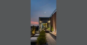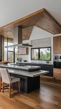 Woah, forget your basic kitchen setup! This place is like the future landed right in your house, totally rocking the modern kitchen design look. See that awesome island with the stone top? That’s where all the cool snack-making or questionable science experiments would go down. Plus, the way the wood fits together on the ceiling looks wild and adds some serious high-tech treehouse vibes. It’s so sleek, you might even feel like you know how to cook just by standing in it.