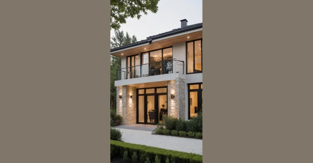 Then there’s the lighting! With all those glowing sconces and recessed lights, this home practically invites you in for a warm cookie and a chat, even if you’re just admiring it from the neat gravel path. The balcony upstairs looks like the perfect spot to pretend you’re royalty surveying your kingdom, or at least a super important person scrolling through TikTok. With its classy stone base and sleek glass railings, it’s clear this modern European masterpiece isn’t messing around when it comes to style. You might even find yourself wondering if the bushes get their own personal hair stylist, they’re just that well-kept!