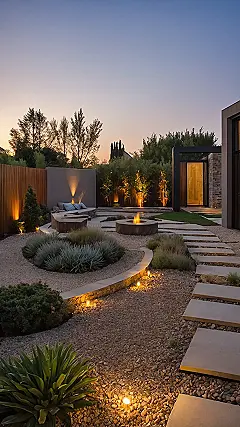 Rocks bring serious vibe to your outdoor space, turning it into a spot you actually want to hang out in, like the cozy fire pit zone in this picture. They aren’t all the same boring grey either; there are different colors and shapes that add texture and interest. Using rocks helps define different areas, like separating the chill-out space from the pathway, making everything feel organized and cool. It’s like giving your backyard a cool, low-key glow-up where even the stones are part of the aesthetic party.