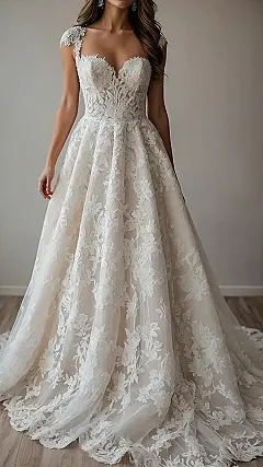 This romantic wedding dress in the picture looks less like an outfit and more like a cloud of pure romance decided to land on a mannequin. Honestly, just wearing something this stunning probably makes you feel like you’re the main character in a movie, ready for your dramatic, slow-motion entrance down the aisle. It’s got so much elegant lace and fabric, you might need an extra seat at the table just for the skirt, and probably a designated train-fluffer whose sole job is to make sure it looks perfect in every single picture.
