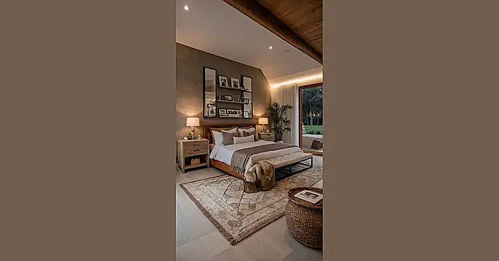 Walking into this room is like getting a warm hug from the decor itself. That bed practically has its own zip code, and with all those fluffy pillows, you might accidentally get lost before you even get under the covers. The soft light makes everything glow like a warm marshmallow, and that rug looks perfect for just flopping onto. It’s the ultimate base camp for epic snoozes and potentially world-record-breaking pillow fights (though the vibe is so chill, maybe just gentle pillow snuggles).