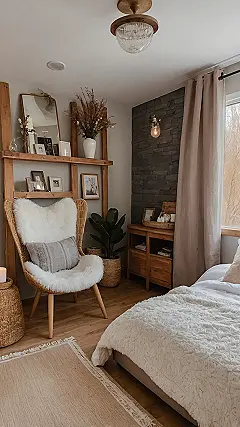 Okay, let’s be real. This room is basically telling my bed to grow some arms and give me a hug. Look at that fluffy white blanket on the bed – I’m pretty sure sinking into that would cure like, 90% of my problems, including the one where I have to wake up in the morning. And don’t even get me started on that chair with the giant furry cushion. It looks like a cloud wearing a cozy sweater. I can already picture myself curled up there, maybe pretending to read a book while actually scrolling through my phone because, you know, peak coziness requires minimum effort.
