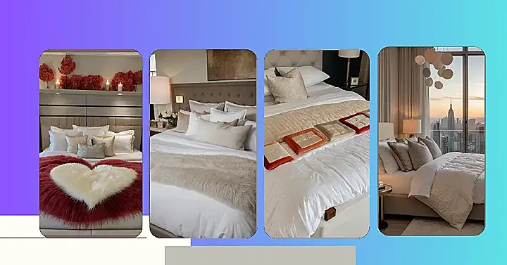 You know, this setup looks so grand, it almost makes you wonder what you’re even supposed to do with it. Do you just stare at the heart decor all night? Or do you carefully tiptoe around it when you get into bed, trying not to mess up the perfect arrangement? It’s like a masterpiece you don’t want to disturb! And those fuzzy pillows? They look like they’re ready for some serious cozy lounging after all the “oohing and aahing” over the romantic gestures. It’s pretty clear this bedroom wants you to feel like royalty, or at least like someone who deserves a really cool, heart-decorated snooze.