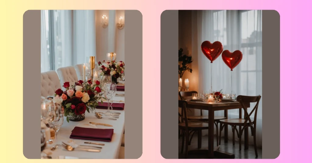 Planning a dinner that screams ‘I actually tried really, really hard to make this special’? This table setup is basically the ultimate playbook for romantic dinner table decor, turning any meal into a major moment. With those gigantic, shiny red heart balloons floating proudly, it’s like they’re shouting “Love is in the air!” (and maybe also “Don’t forget the dessert!”). And the soft glow from all those candles? That’s not just for ambiance; it’s also a secret weapon for making everything look extra magical, even if you accidentally burned the garlic bread a little.