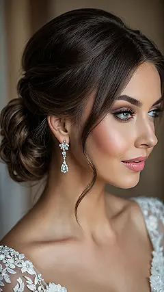 But wait, there’s more! The hair is just one part of this whole ‘wow’ package. See those earrings? They’re practically sending out their own sparkly signals, probably brighter than your phone screen at 3 AM. Paired with that stunning makeup and the delicate lace on the dress, it’s a full-on glam transformation. You know, the kind of look that makes you feel like you could walk a red carpet instead of just down an aisle. It’s all about feeling super confident and maybe just a little bit like a superhero in a fancy gown, ready to tackle anything – even an overly emotional toast!