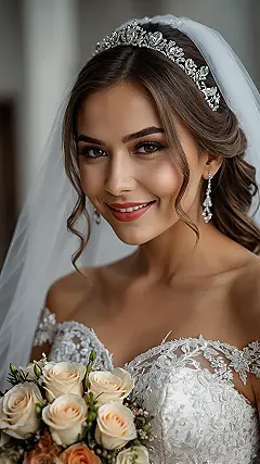 And check out that smile! She’s basically telling us, “Yep, I’m about to get married, and yes, my hair is this perfect without being stuck in a bun!” With her stunning tiara shimmering like a disco ball for a princess and those dreamy roses, her entire look is pure magic. Leaving her classy wedding hair down just adds to that easy-going, yet totally glamorous vibe, proving you can be super elegant without feeling like your head is glued to your neck.
