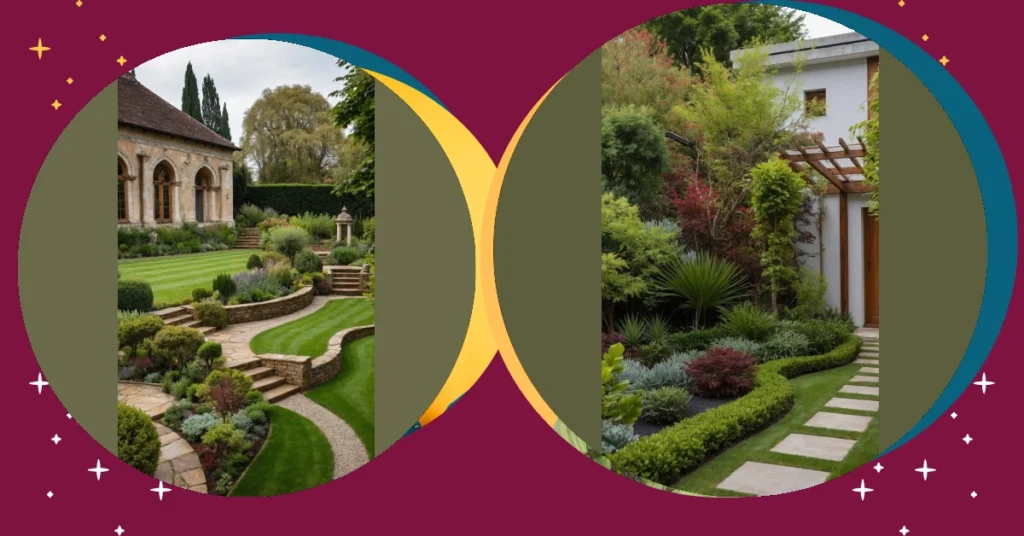 This garden looks like it hired a super-stylish choreographer for its grass! Forget boring straight lines; here, the lawn is doing the cha-cha in a cool zigzag pattern, making every step feel like a mini adventure. It’s like someone decided a regular garden was just too predictable and said, “Let’s give these plants a red carpet, but make it *fun*.” With those perfectly trimmed green patches and smooth wooden edges, you might even expect the garden gnomes to start breakdancing on the gravel paths. This isn’t just a garden; it’s a meticulously planned green escape that probably makes other gardens feel a little jealous of its cool factor.