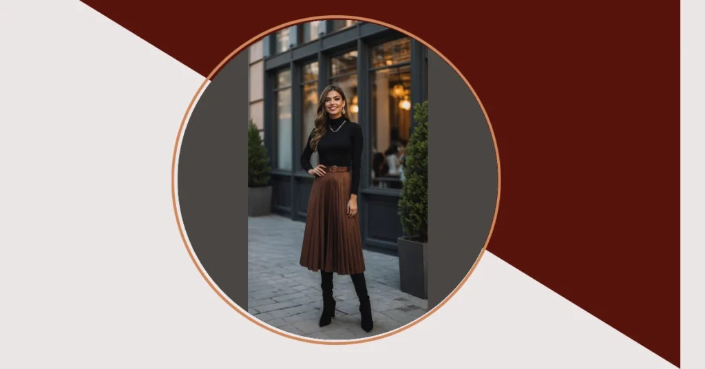 Finding the perfect holiday party outfit can feel like trying to solve a super complicated math problem, right? But look at this awesome outfit! This chic combo, with the comfy black turtleneck and that swishy pleated brown skirt, is basically your secret weapon for looking totally put-together without freezing or feeling like you’re wrapped in tinsel. It’s got that ‘I tried but not *too* hard’ vibe, which is the holy grail of holiday fashion.