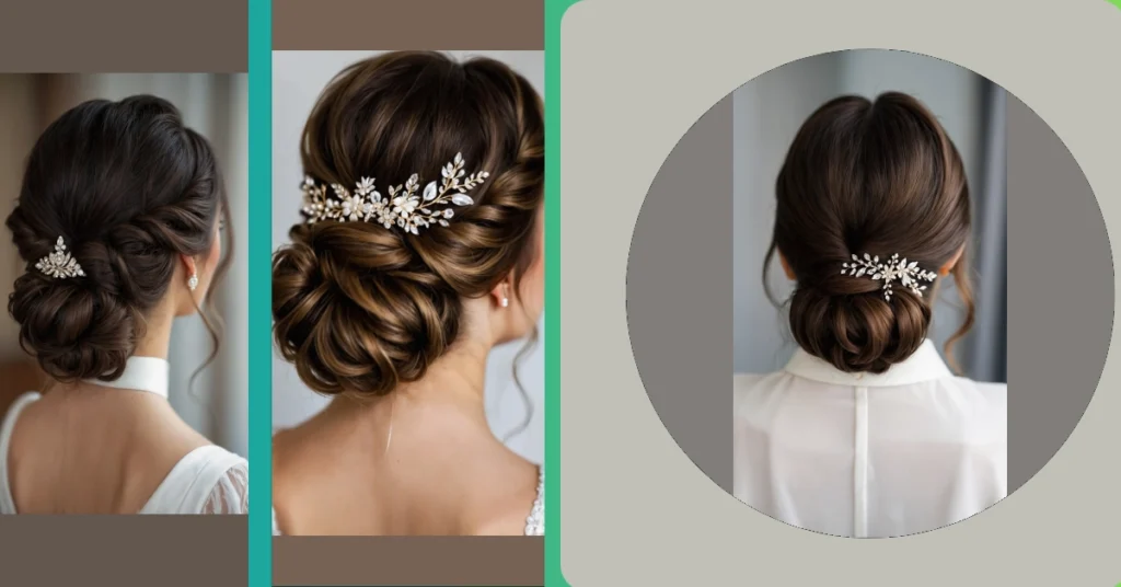 What makes this bun extra special for a big day? It’s that perfect hint of sparkle, like the pretty jeweled clip you see, that takes it from “everyday chic” to “wedding wow” without screaming for attention. This style is like your best friend who always has your back – elegant, reliable, and totally ready for you to bust out your best dance moves without worrying if your updo is going to unravel mid-macarena. It’s the kind of sophisticated look that says, “Yes, I’m ready to get married, and yes, I still want to feel comfortable and awesome all day long!”