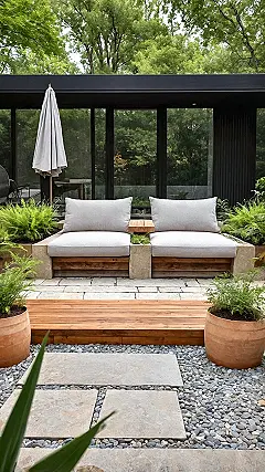 Notice how clever backyard landscaping isn’t just about planting flowers; it’s about making everything work together like a well-oiled chill-machine. Check out the cool mix of textures here: the smooth stone path inviting you in, the cozy wooden deck that feels like a warm hug for your feet, and those scattered pebbles that probably never need mowing (genius!). And those plants? They’re not just there to look pretty; they add life and a fresh vibe, without demanding a ton of fuss. It’s proof that with a little creativity, combining different elements can turn a regular backyard into a total masterpiece, perfect for catching some rays or just escaping the indoor drama.