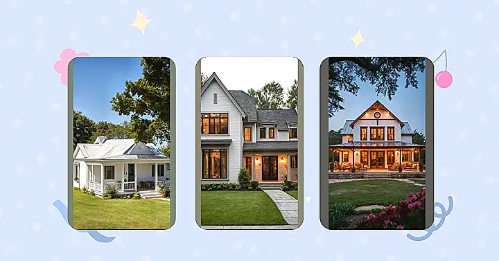 This isn’t your grandma’s creaky old barn, even though it’s rocking some serious farmhouse vibes! Peep this gorgeous house with its crisp white siding and cool black-framed windows – it’s like a super stylish uniform for a home that knows how to look good. The dark metal roof probably means less worrying about leaks and more time dreaming about what to plant in that perfectly green front yard. And check out that fancy trim on the gable – it’s like the house is wearing a tiny, elegant crown, proving that farmhouses can absolutely be fancy without being stuffy. You could totally picture yourself chilling here, maybe pretending you’re a TikTok star living your best rustic-chic life.