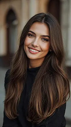 That gorgeous cascade of brown just perfectly frames that smile, making the whole picture look ready for a magazine cover or at least your profile pic game level up tenfold. It’s the kind of hair that probably smells like happiness and fresh baked cookies, adding extra points to whoever is rocking it. Just look at that healthy bounce – it’s almost showing off how great rich brunette hair can be, making the rest of us slightly jealous in the best way possible.