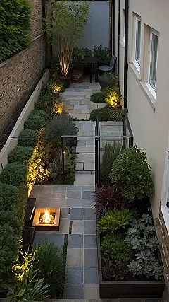 Looking at small yards can sometimes feel like trying to fit a whole party into a closet. But this garden picture just flexes on all those doubts! Someone got seriously creative and turned what looks like a narrow spot into a totally decked-out zone. There’s a cozy fire pit ready for s’mores, clever lighting that makes everything glow, and plants tucked into every possible corner. It’s basically a masterclass in making a little space scream “cool outdoor spot!”