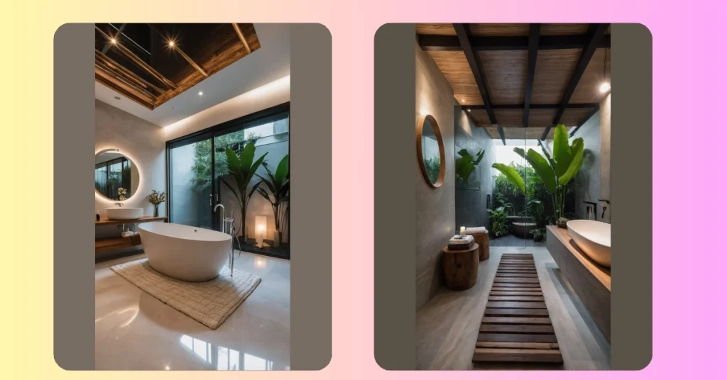 But it’s not just about the awesome view; check out that sleek wooden vanity and the super cool, minimalist wooden toilet seat! Who knew a toilet could look so fancy? The dark wall tiles and the stylish grey floor create a calm, modern vibe that makes those leafy outdoor views pop even more. This isn’t just a place to get ready; it’s an adventure waiting to happen, reminding you that a bathroom remodel can totally transform your daily routine from “ugh, time for school” to “ooh la la, look at my amazing jungle sanctuary!”