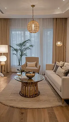 The genius doesn’t stop at the seating, though. Take a peek at that awesome round coffee table – its glass top acts like a superpower, making the room feel open and airy, not squished. Plus, no sharp corners to bonk your knee on during an intense board game session! The different lights, from the cool woven ceiling lamp to the stylish floor lamp, make sure every corner is bright and inviting, proving that even a small space can glow up like a celebrity. This room basically screams, “I might be cozy, but I’m definitely not boring!” It’s all about picking pieces that pull their weight, look fantastic, and still leave room for your dance moves.