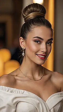 Look at that bun! It’s so perfectly sleek and polished, you’d think it was sculpted by a hair wizard, right? This kind of elegant updo is totally giving us major Sofia Richie vibes, who often rocks a similar put-together look. It’s the kind of hairstyle that makes you feel like you could walk into a fancy red-carpet event, or just ace that big presentation, without a single hair out of place. Forget those messy buns we sometimes try to pull off that end up looking more like a bird’s nest – this is the queen of all buns, ready to conquer the world one dazzling smile at a time!