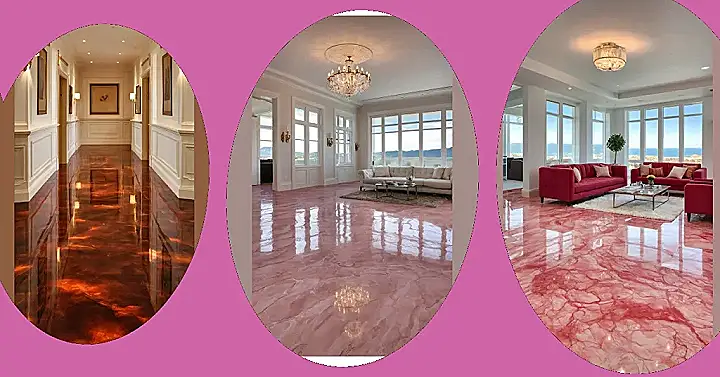 Take a peek at this room – isn’t that floor just ridiculously shiny? It’s so smooth and glossy you can practically see your future (and definitely that giant chandelier!) reflected perfectly, making the whole place feel super grand. This isn’t some rare, expensive stone you’re looking at; it’s the incredible magic of epoxy flooring, which basically turns your plain old floor into a custom masterpiece. It’s like giving your room a superhero cape, but for the floor, complete with a fantastic marbled pink design that’s way cooler than any school hallway.