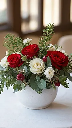 Check out this awesome flower arrangement! It’s like a tiny, fancy party happening right on your table, and everyone’s invited. You’ve got these stunning red roses, totally owning the spotlight, looking all bold and glamorous. Then, chilling right next to them are the cool white roses, bringing in that perfect balance, like the super supportive best friends of the flower world. All that lush green stuff around them? That’s the ultimate hype squad, making sure every single petal stands out and the whole group looks perfectly put-together. It’s definitely not just a random bunch of flowers; someone put some serious thought into making this look like VIP petal goals!