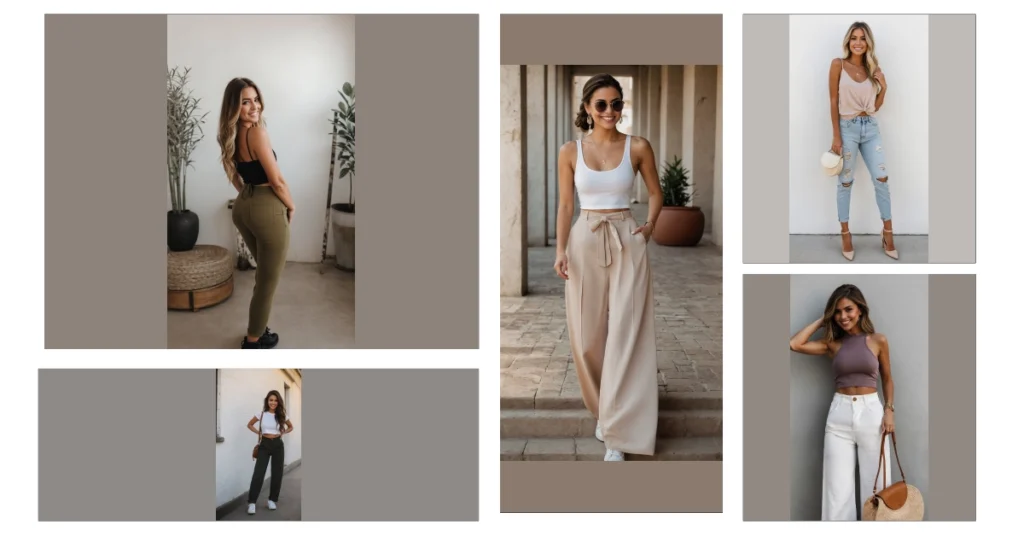 But hold on, because this isn’t just any tank top; it’s part of a whole vibe! Pairing it with those awesome olive pants takes this outfit from ‘basic’ to ‘boss mode’ faster than you can say ‘What’s for lunch?’ It’s the kind of look that says, “I’m super comfy, but also, I could totally ace my next presentation or maybe even win a dance-off.” And let’s be honest, that bright smile isn’t just because the sun is shining, it’s probably because feeling this good in your clothes is a serious mood booster, making everyday tank top outfits feel like a total win!