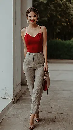Feeling put together in a killer outfit like this lady’s red top and cool plaid pants is basically like finding a hidden level in a video game where you suddenly have super confidence points. You walk out the door feeling like you could conquer the world, or at least ace that pop quiz you totally forgot about. This look screams ‘I know where I’m going and I look awesome doing it’, which is pretty much the vibe we all need sometimes, especially when trying to pull off something totally chic.