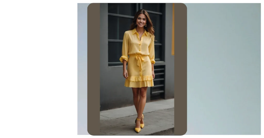 The styling here just takes it to the next level, like adding sprinkles to an already perfect cupcake! Those matching butter yellow heels are a bold and brilliant choice, making the whole outfit flow seamlessly from head to toe. Plus, did you catch the fun ruffles at the bottom? They add a playful bounce to every step, and those subtle gold hoop earrings give just a touch of sparkle. It’s a masterclass in looking chic and cheerful at the same time, proving that sometimes, all you need is a fabulous yellow dress and a big smile to conquer the world!