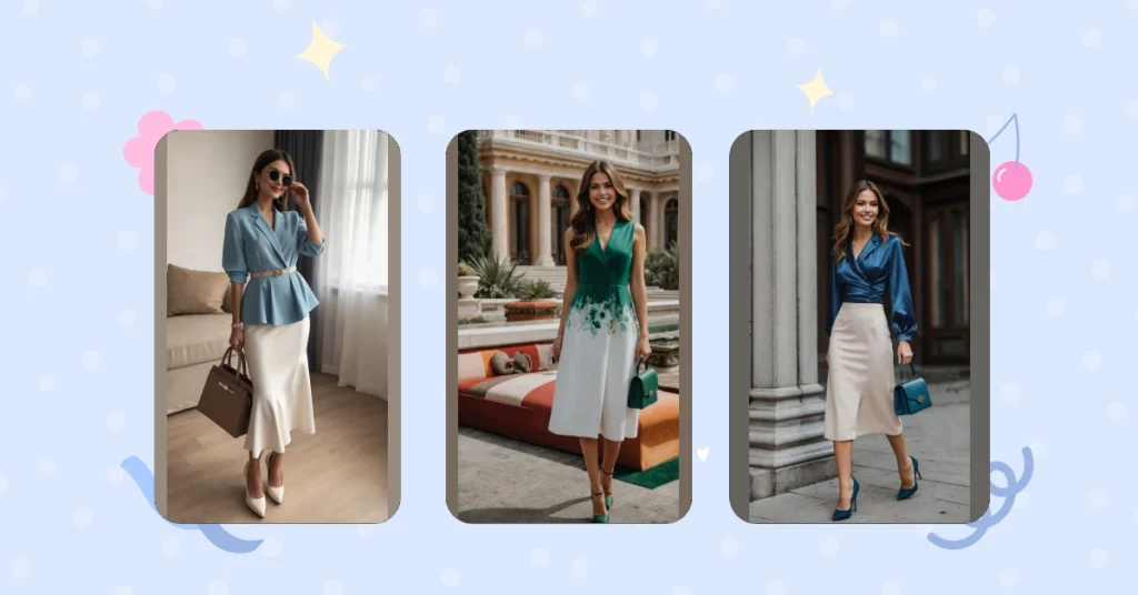 Finding the perfect holiday party outfit can sometimes feel like a mission to the moon, but this look totally nails it! That deep teal satin blouse? It practically screams “I’m festive and fabulous!” without even trying. Paired with that classy beige skirt, it’s a combo that’s elegant enough to impress your aunt, but cool enough to make your friends say, “Where did you get that?” You’ll be ready to snap some awesome selfies and maybe even try to sneak a few extra cookies when no one’s looking.