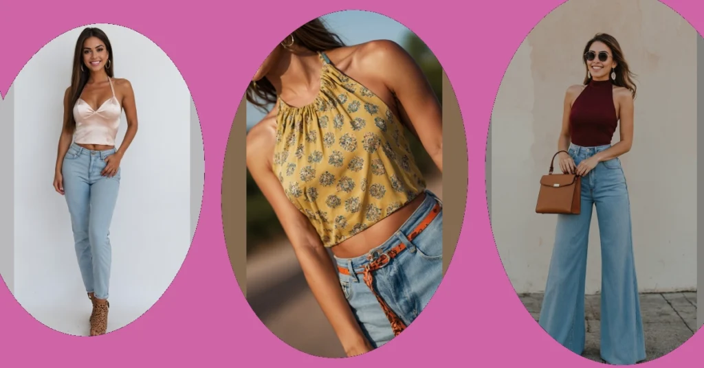 Now, let’s look at the whole package! Teaming this awesome halter top with a pair of comfy blue jeans? That’s a total power move! It’s the perfect blend of dressy and chill, great for when you want to look sharp but also be ready for anything – from hanging out with friends to tackling your homework (or just scrolling through TikTok). Throw on some shiny hoop earrings and grab a simple clutch, and voilà! You’ve got an outfit that screams “I’ve got this!” without actually screaming. It’s a foolproof way to feel confident and super stylish, showing everyone you’re ready for whatever your day throws at you.