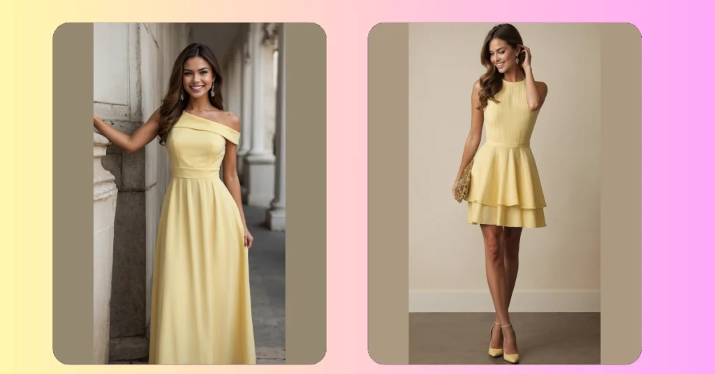 Stepping out in a butter yellow dress is basically a superpower that makes everyone around you instantly happier. Seriously, this dress isn’t just an outfit; it’s a mood enhancer wrapped in fabric, brighter than your crush’s future. The one-shoulder style in the picture adds that extra dash of “I’m fabulous and I know it” without even trying too hard. It’s the kind of dress that makes you feel like you just main-character’d your way into a rom-com, ready to spread sunshine and maybe get asked for fashion advice.