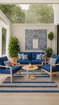 Look closely at how everything works together to make this spot so inviting! The little plants on the coffee table are like tiny, low-maintenance pets, bringing extra life to the room. And that cool, leafy artwork on the wall? It’s a stylish high-five to the nature just beyond the glass. Even the funky blue rug with its leaf pattern ties the whole “outdoor oasis” vibe together, making your feet feel like they’re walking through a really comfy, indoor forest. It’s all about decorating your sunroom so well, even the sunbeams want to hang out.
