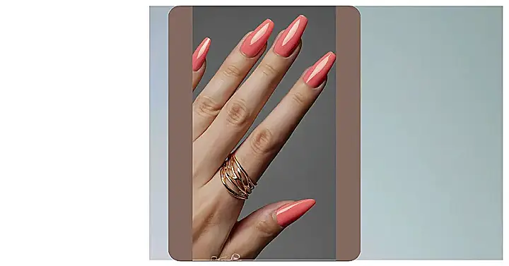 Check out these nails! They’ve totally nailed (pun intended!) that perfect summer vibe. That gorgeous peachy shade is like a sunset mixed with a strawberry smoothie – somewhere between pink and red, but pure sunshine on your fingertips. And seriously, those long, glossy tips? They look sharp enough to cut through the summer heat and stylish enough for any warm-weather adventure. Add that cool layered gold ring, and you’re basically a walking summer mood board.