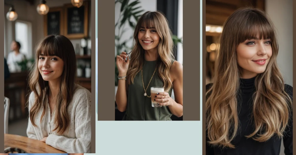 Beyond those fantastic bangs, this whole look screams “effortlessly cool.” She’s got that lovely layered drink, looking all cozy and delicious, while holding what looks like a tiny, shiny hair clip – maybe for a quick touch-up or just to play with. Her long, wavy hair flows beautifully, and those stacked bracelets add a pop of subtle style. It just goes to show that a great haircut, like her stylish bangs, really pulls everything together, making you feel confident enough to conquer the day, one happy sip and radiant smile at a time. Total good vibes all around!