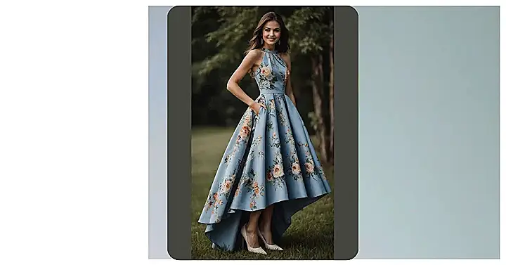 Forget squeezing into something stiff! This kind of women party dress is giving off major “I’m here to have fun and maybe stash snacks in my pockets” energy, which is basically the dream for any party, right? Seriously, check out the cool flowers on this dress; they look like they bloomed just for the dance floor. You just know wearing this would make you feel as happy and ready to rock as the super-smiley person in the picture!