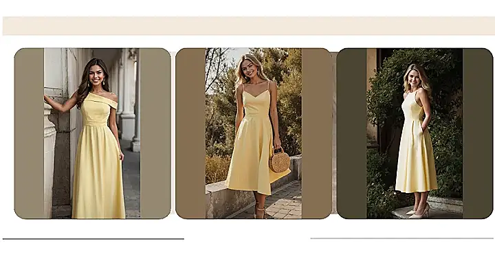 To really nail this sunny vibe, it’s all about choosing accessories that complement without stealing the spotlight. Our model here is a masterclass in elegant simplicity, rocking some super cute light-colored heels that say, “I’m classy, but I also enjoy a good meme.” And those sparkly earrings? They’re like tiny disco balls for your ears, adding just enough shimmer to catch the light and make you sparkle even more. So, next time you don a butter yellow dress, remember to pair it with confidence, a big smile, and maybe a pair of shoes that are comfy enough for spontaneous dance-offs!
