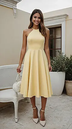 This total sunshine-in-a-dress look is making us want to twirl right into summer! That butter yellow isn’t just a color; it’s a whole happy vibe, like wearing your favorite scoop of lemon gelato on a perfect day. With its chic halter neck and a skirt that’s ready for any spontaneous dance party, this dress gives off major “I’m here to have fun and look fabulous” energy. It’s bright enough to grab attention but soft enough that you won’t accidentally blind anyone, making it a perfect pick for feeling effortlessly radiant.