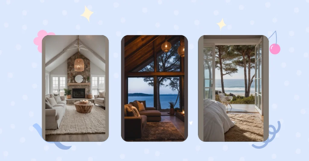 This room basically screams “stay here forever” with its super comfy-looking bed and that fluffy rug that probably feels like walking on clouds. It’s got all the chill vibes you’d want for perfect lake house decor, like keeping things bright and simple so the real star of the show can shine. And wow, what a star! You wake up to this incredible view of what looks like the biggest, bluest lake you’ve ever seen, with waves rolling in and those cool trees standing guard. Someone might have accidentally dropped this “lake house” right on the ocean, but hey, we’re not complaining about the bonus salty air!