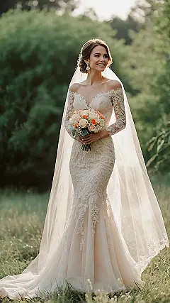 Forget about walking, this gorgeous mermaid wedding dress practically lets you glide down the aisle like you just swam out of a fairy tale! With its stunning off-the-shoulder design and lace that looks like delicate ocean foam, it perfectly hugs every curve before gracefully flaring out at the bottom. It’s so breathtaking, you might just convince everyone you have a secret tail hidden underneath, ready for a dip in the ocean right after saying ‘I do’!