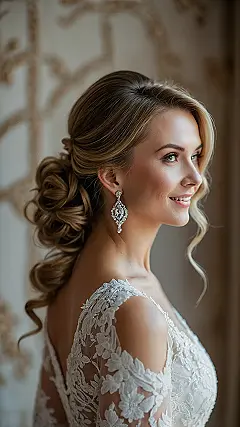 And let’s be real, an updo like this isn’t just about the hair; it’s about the whole vibe! Paired with those mega-watt sparkly earrings that practically have their own zip code and a dress that looks like it was made from spun moonlight, you’re basically channeling your inner celebrity. This classic wedding look is all about feeling confident and gorgeous, without having to stress about whether your hair can survive an entire day of photos, hugs, and maybe even a surprise chicken dance. It’s like saying, “Yep, I woke up like this… with a little help from a hair stylist and a whole lot of hairspray!”