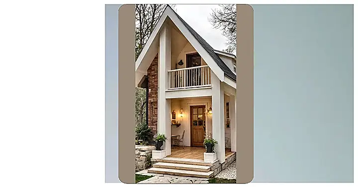 Forget trying to find your way through endless hallways in a giant mansion; this tiny house is all about smart style and cozy vibes! Look at those awesome stone steps leading up to the front door, just begging you to come in for a cup of hot cocoa. It’s got a sophisticated stone chimney that probably whispers tales of cozy winter nights, and that huge arched window isn’t tiny at all – perfect for spying on squirrels or staging your most dramatic selfie. This place proves that you don’t need a sprawling estate to make a big impression, just a whole lot of charm packed into a smaller, more manageable package.