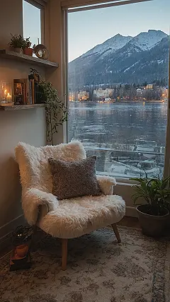 Peeking out from your cloud-chair, you get this amazing view: snowy mountains reaching for the sky and a half-frozen lake twinkling with lights from the town across. It’s like something out of a movie, making it the ultimate backdrop for any story you’re reading. Who needs Netflix when you have a live, epic scene unfolding right outside your window, paired with a good book and maybe a hot chocolate? This reading nook is basically a teleportation device for your brain, whisking you away from homework stress to a world of pure, cozy chill.