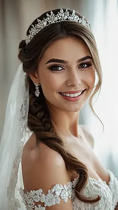 But wait, there’s more! Notice those shimmering, leaf-like sparkles tucked into the braids? That’s the secret sauce that takes this from “nice hair” to “wow, she looks like she just stepped out of a fairy tale.” It’s like the hair itself decided to dress up for the party, adding just the right amount of glitter without going full disco ball. You just know this bride will be turning heads, probably making everyone else wish their hair could look this effortlessly amazing for, say, a regular school picture day.