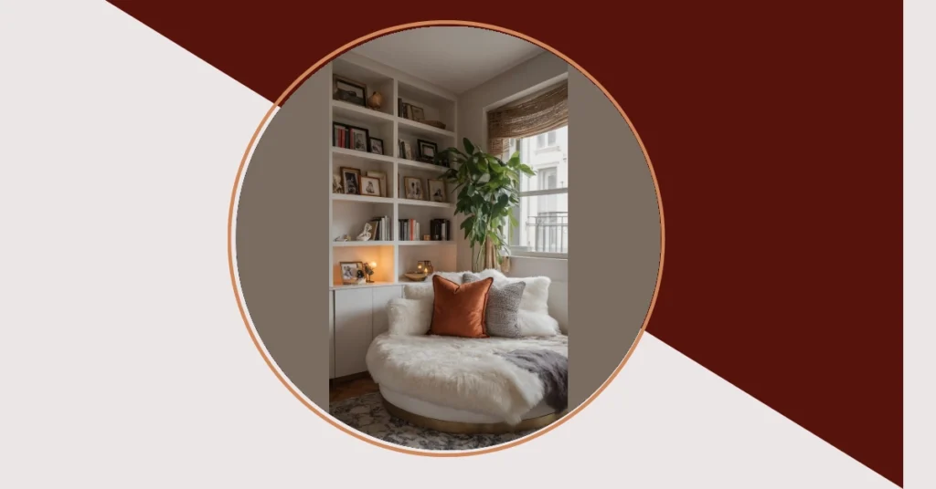 But it’s not just about the super comfy spot. Look at those shelves! They’re packed with cool books, framed photos, and little treasures that really make the place feel lived-in and totally *you*. And that big green plant by the window? It’s like a mini jungle, bringing good vibes and fresh air inside, which is awesome for apartment living. Plus, the warm, glowy lights just scream “grab a blanket and some snacks!” Decorating your apartment is all about mixing comfort with cool stuff that shows off your personality, turning any corner into your favorite hangout without needing a mansion. Who knew coziness could be so stylish?