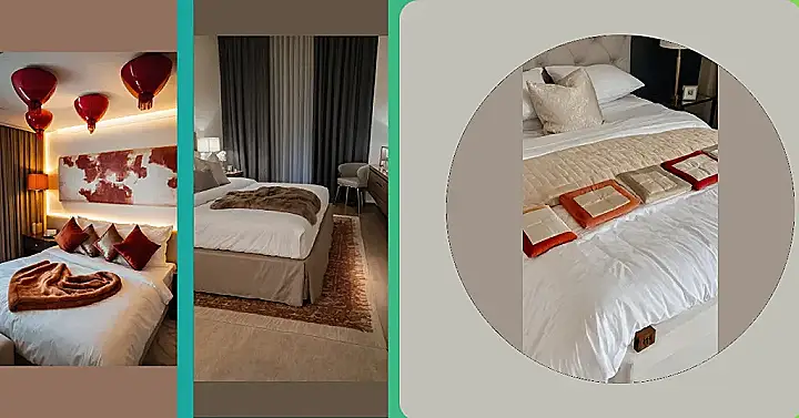 This bed definitely screams “special occasion!” Forget scattering boring old rose petals that you have to vacuum up later; this room took it up a notch with a whole heart-shaped border made of fancy little red jewels or fabric hearts. It’s like someone said, “Let’s be romantic, but also, let’s make it sparkle and ensure no one accidentally steps on a soggy petal!” Plus, that giant plush heart pillow in the middle looks super comfy. You just know whoever set this up was aiming for maximum “awww” factor, and probably earned some serious brownie points.