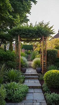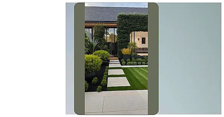 And let’s not skip over that super chic stepping stone path – it’s basically a catwalk for your feet, leading you straight to what looks like the coolest house on the block. Peeking through that awesome green archway, you can even spot a cozy lounge area, making you wonder if this isn’t just a front garden but actually a secret outdoor spa. The way the hedges are shaped and those bright green plants are just chilling in their sleek black pots makes everything feel so put-together, it’s like the plants themselves are wearing designer outfits. You’d probably feel fancy just walking up to the door here, trying not to mess up anything with your mere human presence.