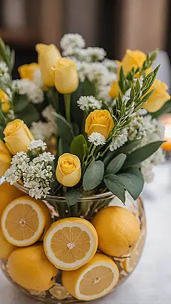 Look at that table centerpiece! It’s basically a party in a vase, and the guest list includes some perky yellow roses, fluffy white flowers, and a whole bunch of lemons chilling at the bottom. Who knew decorating your dining table could be as simple as grabbing some fruit and flowers and sticking them together? It looks bright and cheerful, like a little burst of sunshine decided to land right in the middle of your meal. Just try not to get distracted by how cool it looks and forget to eat your food!