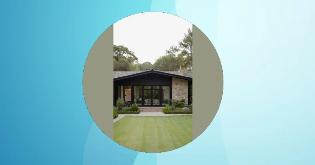 Check out this ranch house! It’s like the cool, older sibling of all other ranch houses – you know, the one who always looks effortlessly stylish. With its slick black exterior and huge glass doors, it practically whispers, “Come on in, but please take off your muddy shoes, we have standards!” This isn’t just a place to live; it’s a sleek, modern statement, probably dreaming of hosting epic movie nights with that giant, perfectly striped lawn as its personal red carpet. You can almost feel the vibes of chill hangouts and sunshine-filled afternoons radiating from it.