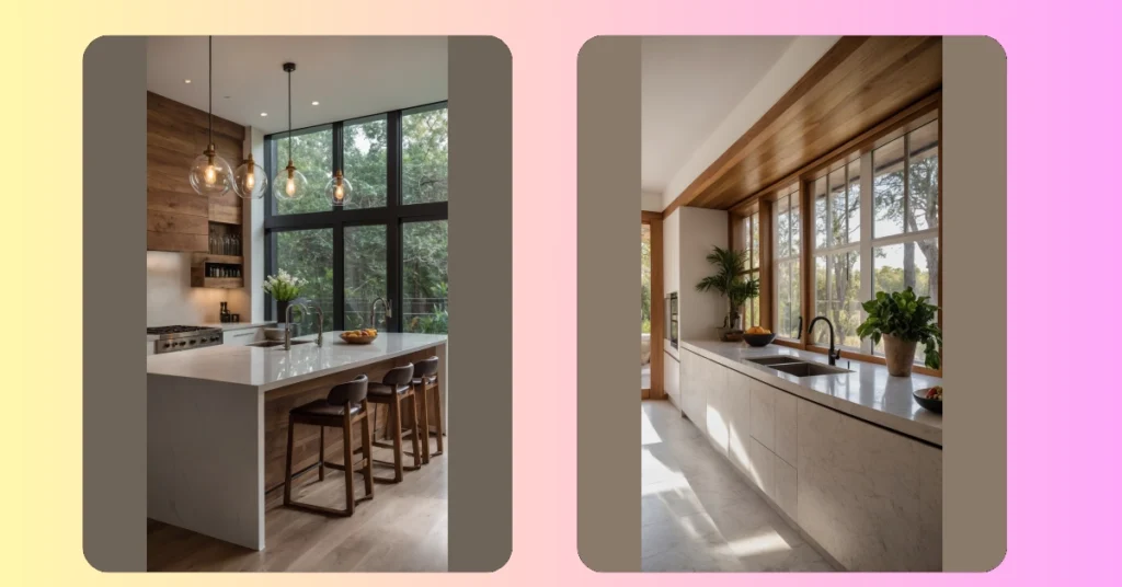 Stepping into this designer kitchen is like walking into a chill, super-stylish nature retreat, but with a sink! Those huge windows let in so much sunshine and give you a front-row seat to the great outdoors, which is way better than staring at a blank wall while you’re reluctantly doing the dishes. With its sleek marble counters and cool wooden accents, this kitchen basically whispers, “Don’t even *think* about leaving a dirty mug out.” You might even find yourself volunteering to help clean up, just to hang out in such a cool space, though we’re pretty sure those plants are silently judging your scrubbing technique.