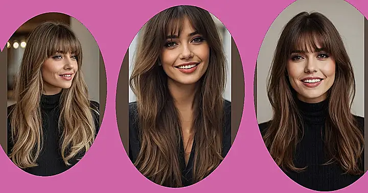 These aren’t just any bangs; they’re the kind that elegantly part down the middle, like a velvet curtain opening for a show-stopping performance (which is your face, obviously!). They work like magic with long hair, just like our smiling friend here shows off, adding a touch of effortless cool without feeling too heavy or in-your-face. Plus, if you ever decide you want to switch up your look, they grow out super gracefully, blending into your layers without that awkward ‘half-bangs, half-forehead’ phase. It’s basically the hairstyle equivalent of having your cake and eating it too, looking fabulous the whole time!