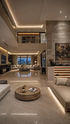 Step into this living room and you might feel like you just walked onto a movie set, or maybe into your ultra-rich cousin’s house. That massive TV is practically begging for a serious movie marathon or an epic gaming session, though you’d probably need to wipe your fingerprints off the screen every five minutes. It’s so sleek, with those cool marble walls and fancy lights, you half expect it to start playing classical music on its own, just to match the vibe.